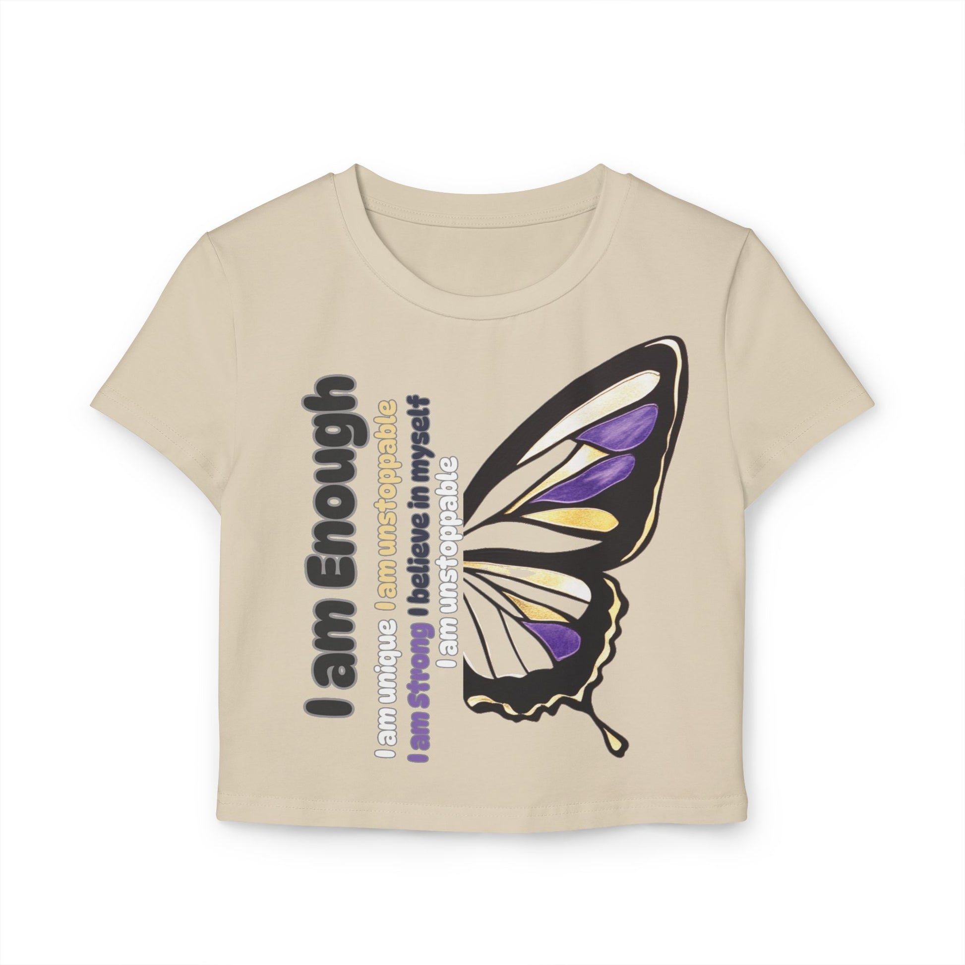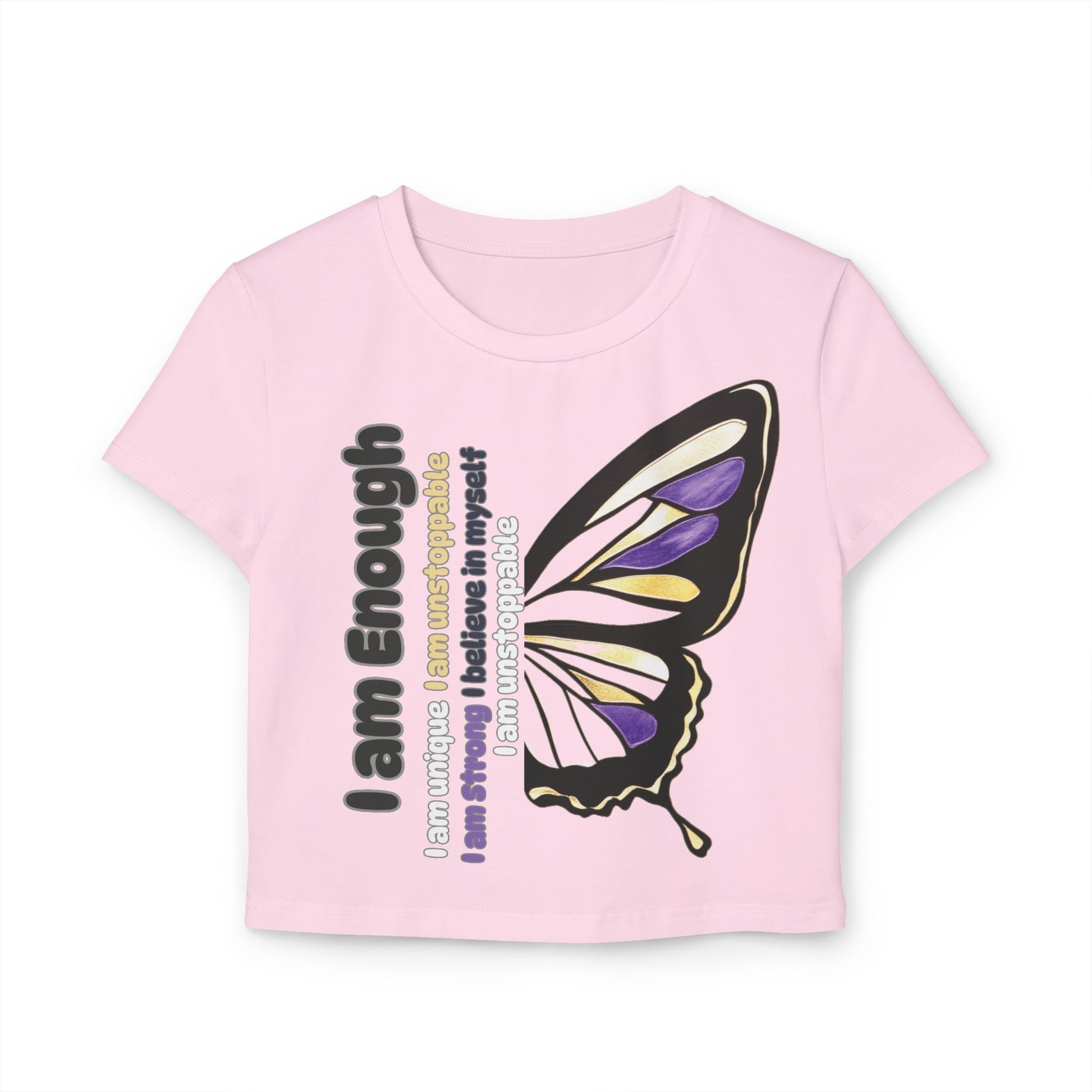 Whether paired with jeans for a laid-back look or layered under a jacket for added style, this women’s baby-t is versatile and functional. Embrace your journey, inspire those around you, and wear your affirmations proudly with this beautiful butterfly-inspired design. Treat yourself or someone special to this meaningful and chic baby-t, perfect for everyday wear that uplifts and inspires.